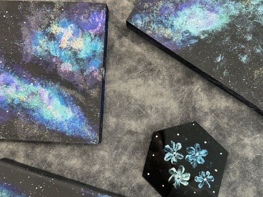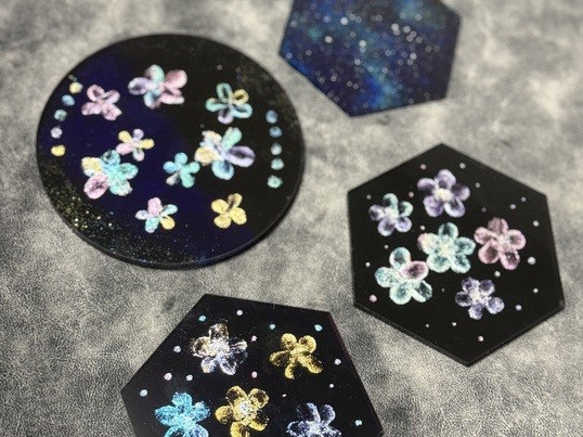 筆も使わず指でくるくるポンポンするだけで、キラキラの宇宙が出現!アクリルのコースターはツヤ感があり、とても美しく仕上がりました。