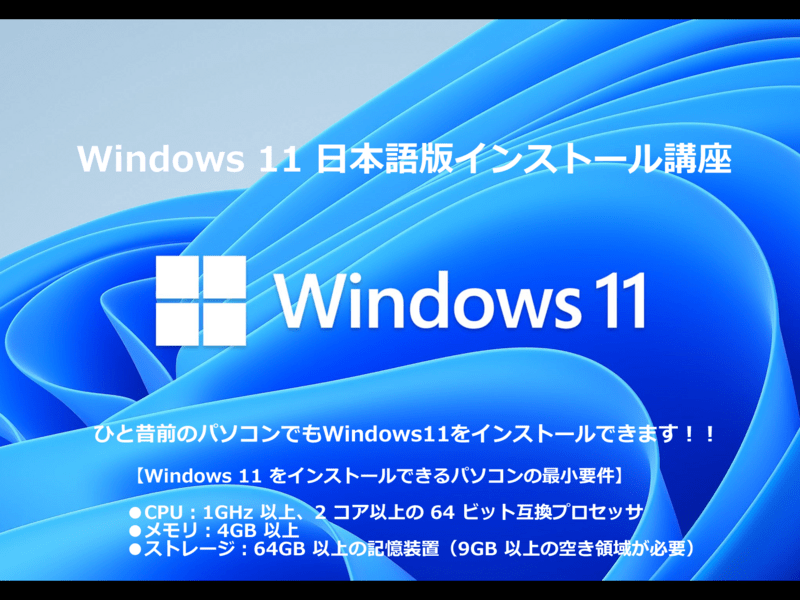 本講座の内容は、新規インストールおよび Windows 10 からのアップグレードの両方に対応しています。そのため、Windows 10 以外のパソコンでも、必要な最低スペックを満たしていれば新規インストールが可能です。