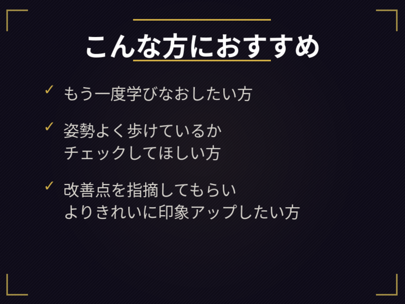 姿勢と歩き方は印象を大きく左右します。洗練された歩き方は練習を重ねれば確実に身につく。印象が良くなり、堂々とした自信あふれる自分になります!