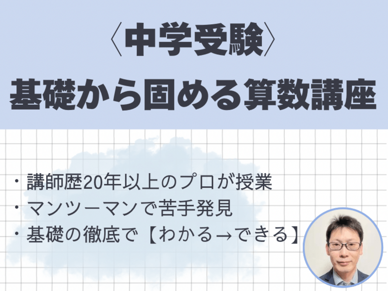 講師歴20年以上。中学受験算数を専門に、これまで数百人の受験生をサポートしてきました。長年の経験から、お子様がつまずきやすいポイントや、どこで理解が追いついていないかを的確に見抜くことが得意です。
