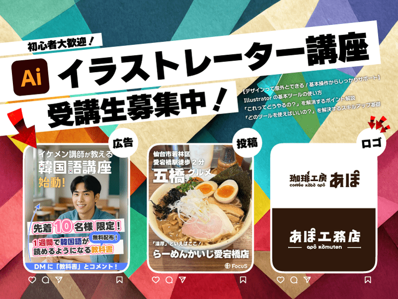 はじめまして。私はグラフィックデザイナーとして活動している三上雄大です。これまで広告デザインやブランドロゴ制作、SNS用ビジュアルデザインなどを手がけ、Adobe IllustratorやPhotoshopを日常的に使い続けてきました。独学で学ぶとつまづきやすい基本操作から、プロならではのクオリティアップのコツまで、実践を通じて丁寧にお教えします。