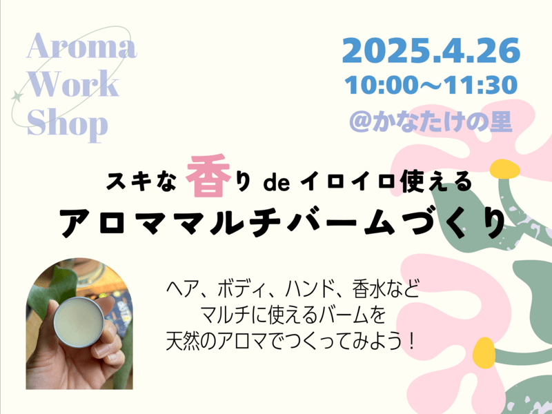 植物のパワーを最大限に受け取れるアロマで、お顔、ボディ、ハンド、ヘア、香水代わりにも使えちゃうアロママルチバームを作ってみませんか?