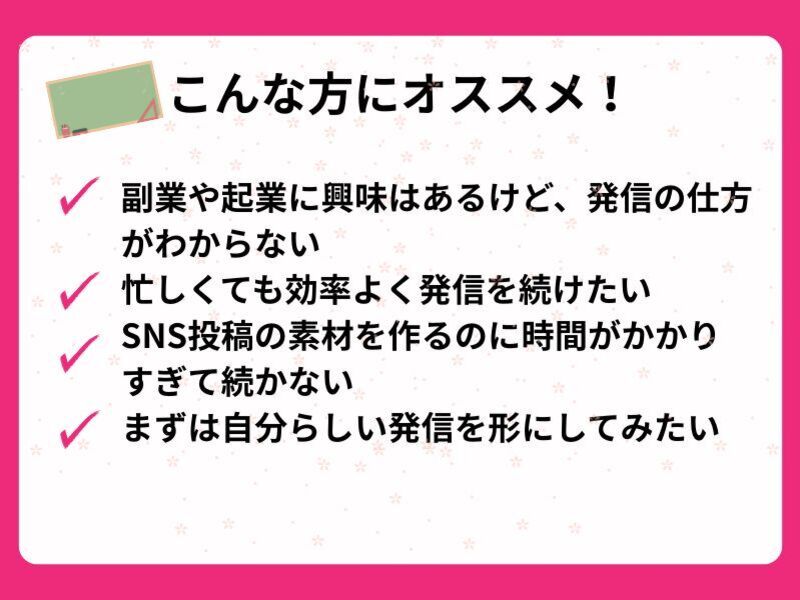 テンプレートを使ったデザインや、ChatGPTでの文章作成のポイントなど、実践的ですぐに使える内容ばかりで、学んだその日から投稿に活かせました☺️
