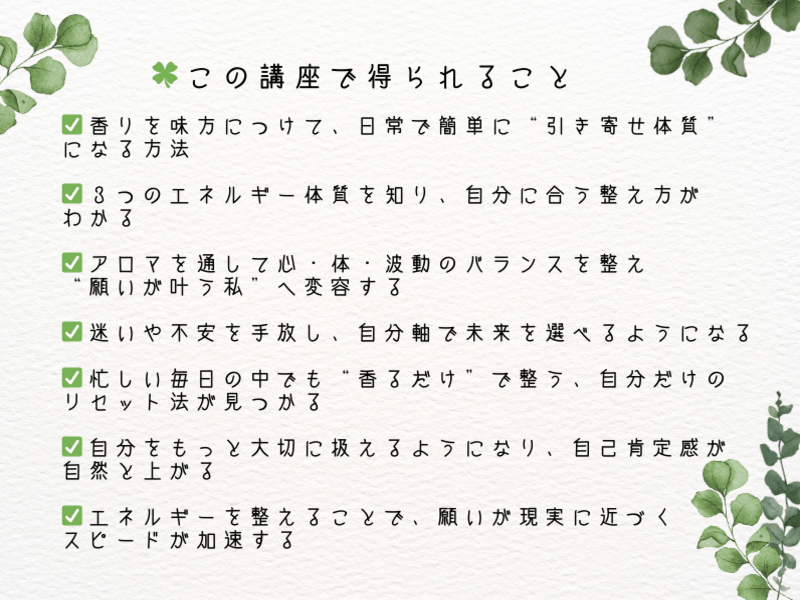 アロマで癒されるし開運も出来ちゃうし最高だと思いました!作る体験も楽しく出来ました✨