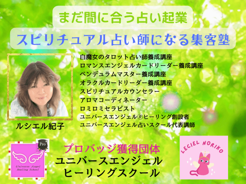 ユニバースエンジェル®ヒーリングスクールはじめまして。ユニバースエンジェル®ヒーリングスクールの代表講師、ルシエル紀子です。当スクールは12年に渡り対面セッション、そしてオンラインで占いやヒーリング、チャネリングなどを伝えてきた占い専科のスクールです。ストアカでは2021年8月~スタートししました。わずか半年でプラチナ講師に認定された実力派スクールです。元... +続きを読む