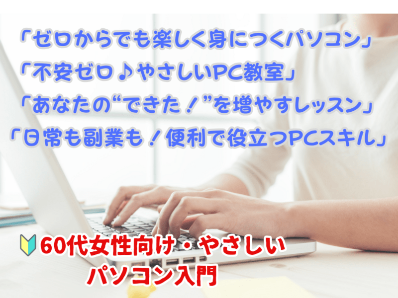 💻パソコン初心者🔰や主婦の方に向けて、特に60代からの「パソコン初めてさん」「ちょとさわると壊れそうで怖い…」などのお悩みにお応えし、寄り添うサポートを心がけています。