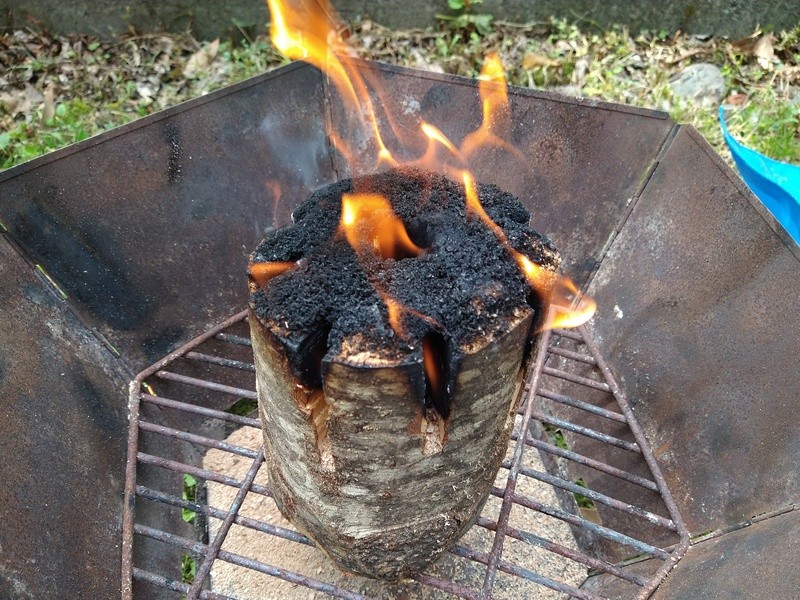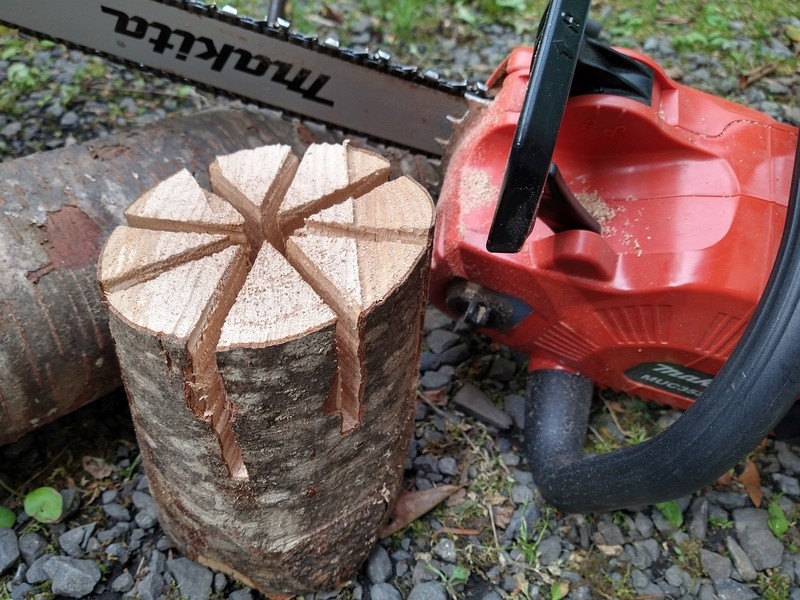 チェーンソーで丸太を切ってスウェディッシュトーチ(スウェーデントーチ)を作ります。