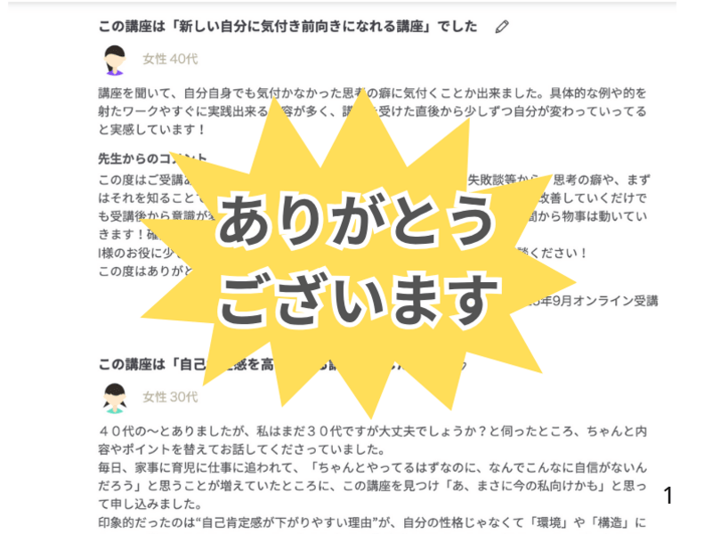 講座を聞いて、自分自身でも気付かなかった思考の癖に気付くことか出来ました。具体的な例や的を射たワークやすぐに実践出来る内容が多く、講座を受けた直後から少しずつ自分が変わっていってると実感しています!