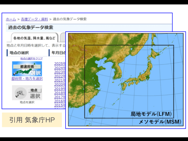 ・気象データの題材としては、気象庁ホームページから取得できる現在と過去の気象データ、国内外の気象関係サイトから入手でき各種気象データ、および講師が気象業務支援センターと契約に基づき配信を受けているGPV数値予報データを使います。