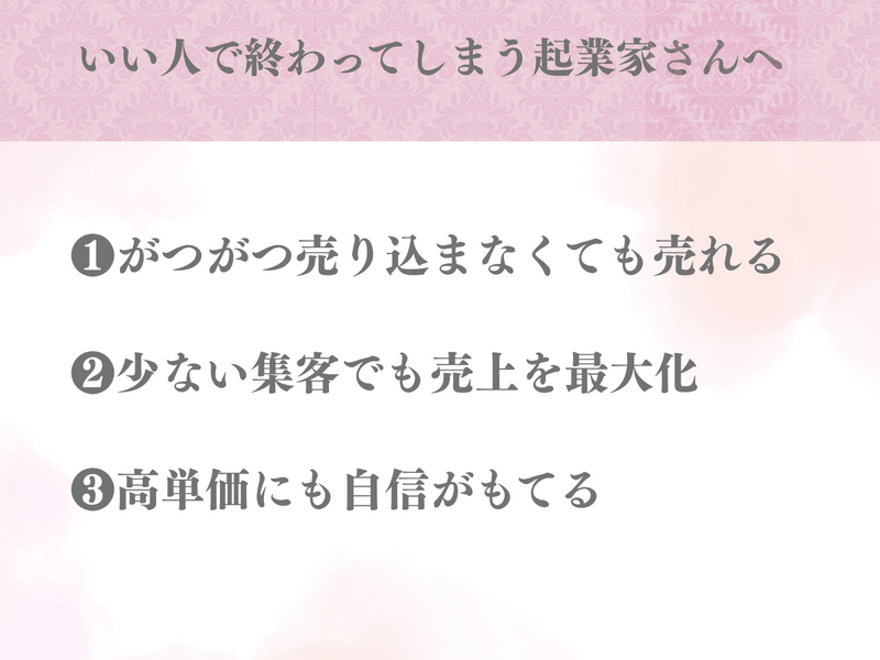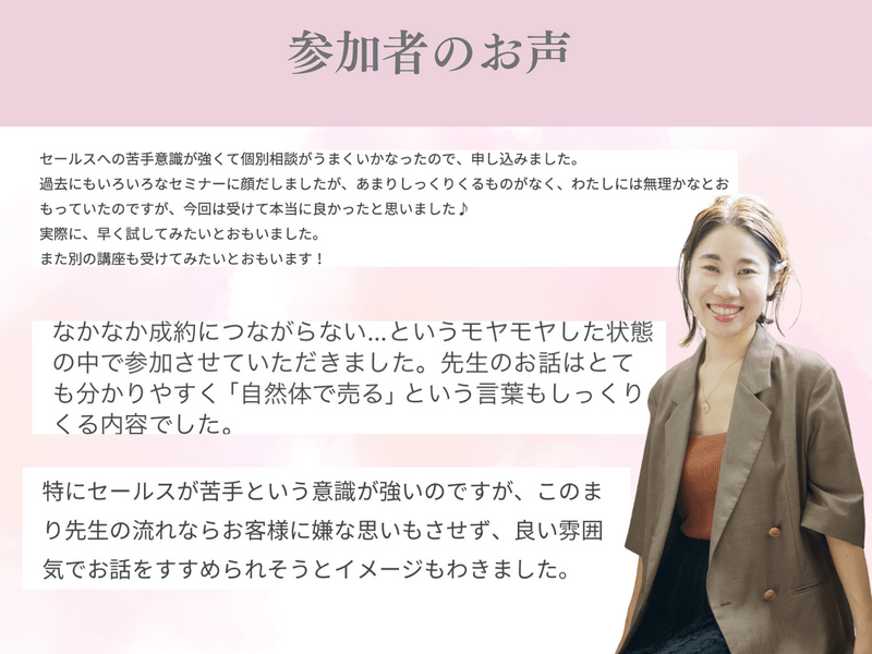 お客様の話を聞いているつもりでいたのですが、これが「つもり」で、もっとお客様への具体的な質問力やバリエーションなどを引き出していただけて、あっという間の一時間でした。(このお値段はお得すぎます!)