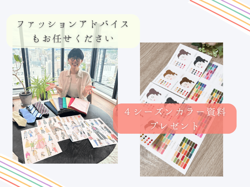 この色は似合わない。この色が絶対良いという言い方をされないのも良かったですし、資料を見ながら服装の色味の組み合わせやバランスのアドバイス。メイクのアドバイスもいただけたのもありがたかったです。