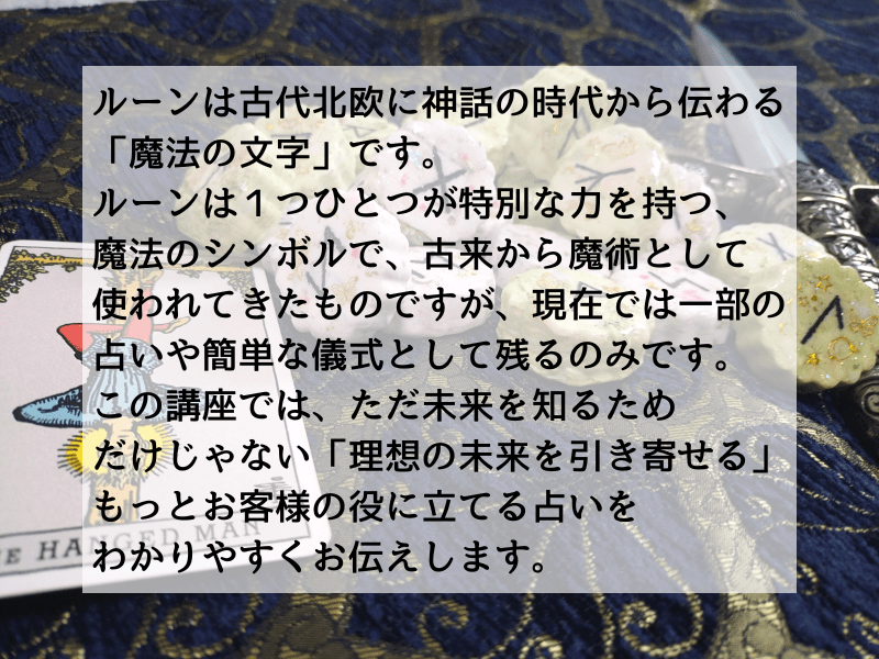 ルーン鑑定について親切丁寧に教えてもらった後に自分でやってみる実践もあるので聞いて終わりではなく腑に落ちる講座でした。こちらの作業で手間取っていましたが待ってくれる優しい先生です。今後の人生についても親身に相談にのって頂き有り難い講座でした。ありがとうございました!!