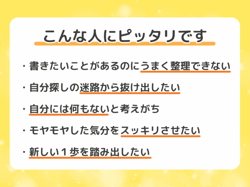自分の思ってることなんでもいいので書いてみてください。と言われ、書けるかなあと思いましたが、書き始まったら意外と書けてました。書いているうちに、書くのがこの短時間でも楽しくなりました!自分ってこんなこと考えてるんだーと目に見えるのがとても良かったです。書き出すだけではなく、そこから深堀していくと意外と自分の中にあるものがまだまだ出てきてないということも分かりました。