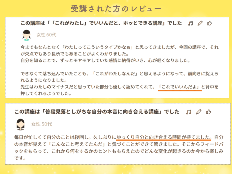 自分がこれからどうなっていきたいのか、悩みがあって全く行動に移せないでいるっていう方にはとってもオススメの講座だと思います。