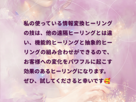 この情報変換ヒーリングの技は目に見えない量子の世界の変換する技を行いお客様の望む意図する未来への定義づけをすることで日常が変化していくことができます。