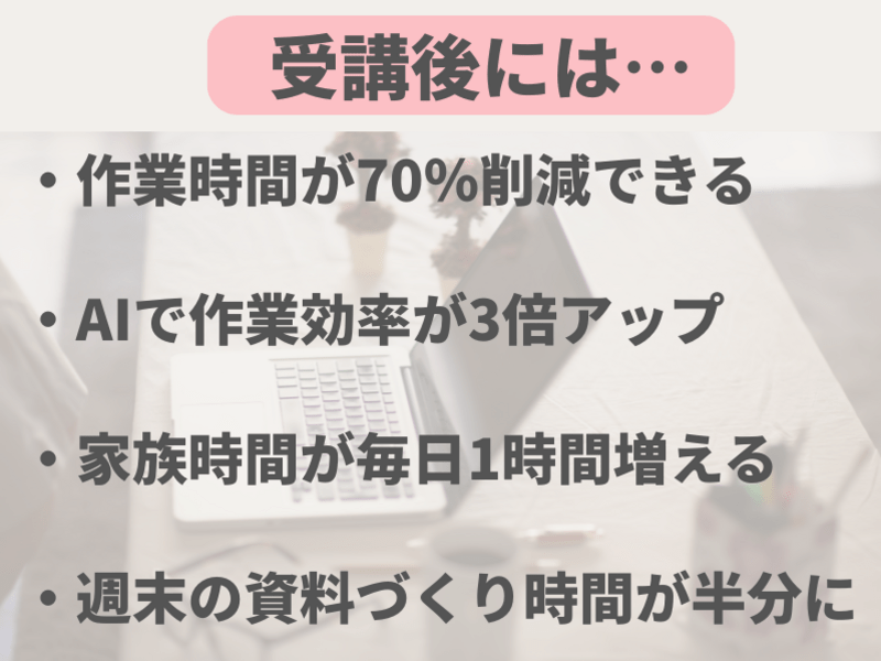 もしあなたが今、「もう資料づくりに追われたくない」「もっとラクになりたい」と感じているなら、ぜひ一度この講座でAIの力を体験してみてください。