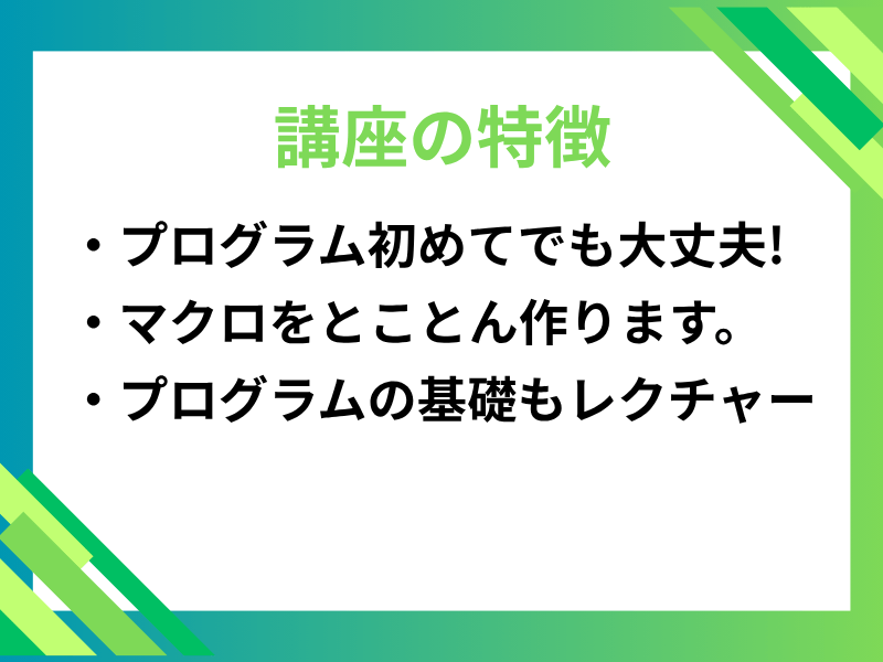 本講座では、実際に様々なマクロプログラムをChatGPTと一緒に作成しながら、プログラミングの基礎を合わせて学ぶことができます。
