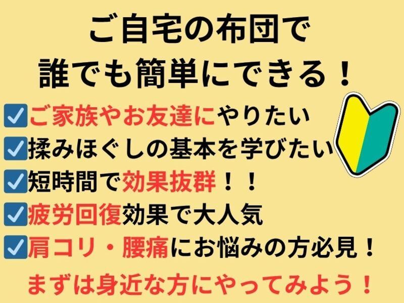 初心者・未経験大歓迎✨誰でも簡単にできる肩こり・腰痛改善マッサージで今日からあなたもセラピストに✨自宅の布団でできる技術です!