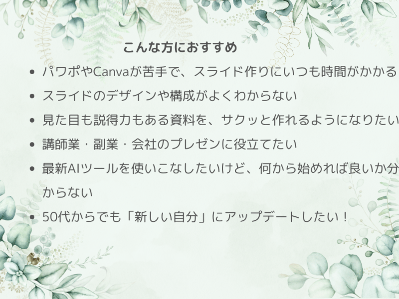 この講座は、50代からの「伝わるスライド作り」を