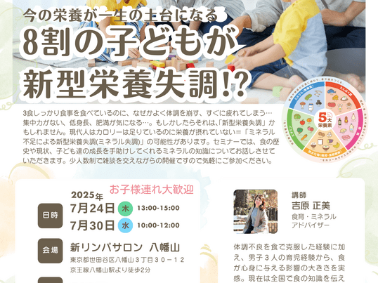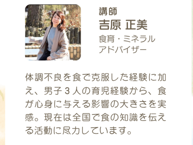 体調不良を⾷で克服した経験に加 え、男⼦3⼈の育児経験から、⾷ が⼼⾝に与える影響の⼤きさを実 感。現在は全国で⾷の知識を伝え る活動に尽⼒しています。