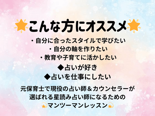 星占いは毎朝テレビでチェックして楽しんで満足している程度なので、難しいかな?と不安でしたが、先生がとてもかわいらしく、ゆったりとした雰囲気の方だったのでリラックスして受講できました。