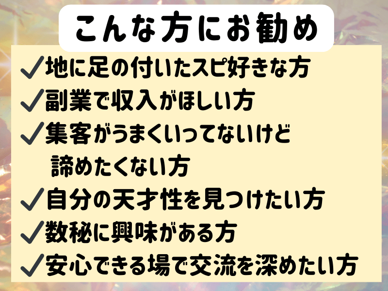 自分の本質や強みを知ってビジネスに活かしていきたい方やスピリチュアルも好きだけど地に足もつけたい方におすすめの内容です。
