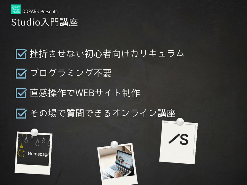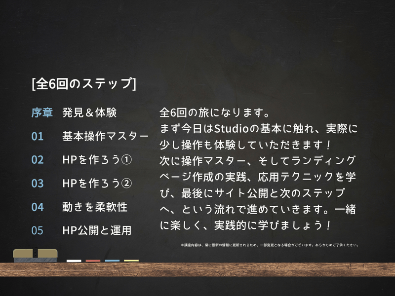 ノーコードツール「Studio」を使い、Webサイトを自力で企画から公開までできるようになることが最終ゴールであると提示します 。
