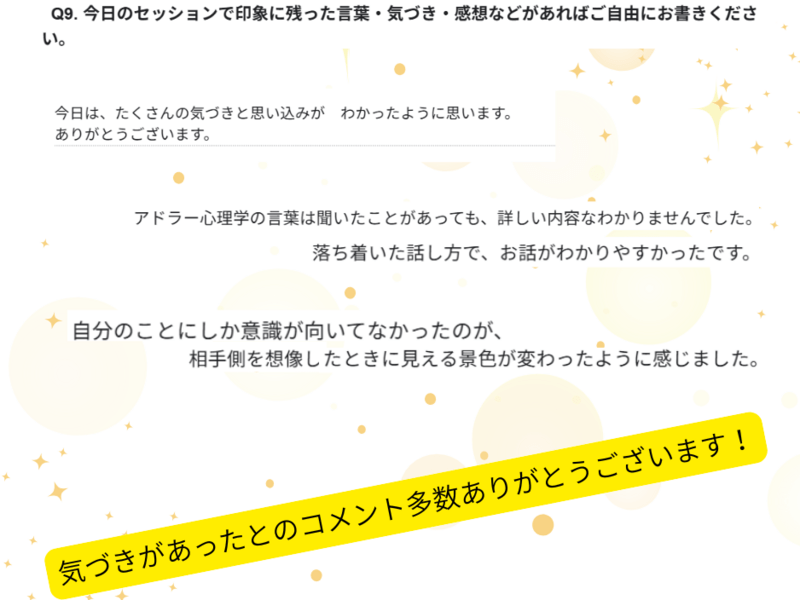 本やYouTubeで心理学や自己啓発を学び、「考え方は変わったはず」なのに、現実の人間関係や感情が同じ場所をぐるぐる回っている感覚に悩んでいました。そんな停滞感を抱えて受講しましたが、結果として「この先生にお願いして本当に良かった」と心から思える時間になりました。