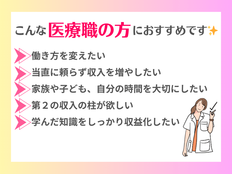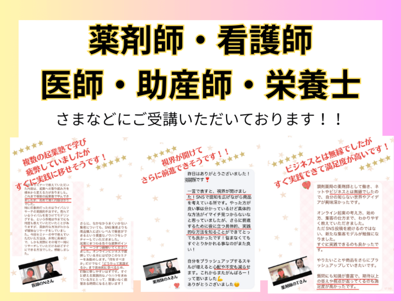 私は現在、薬剤師として、医療職の副業サポートを行っています。