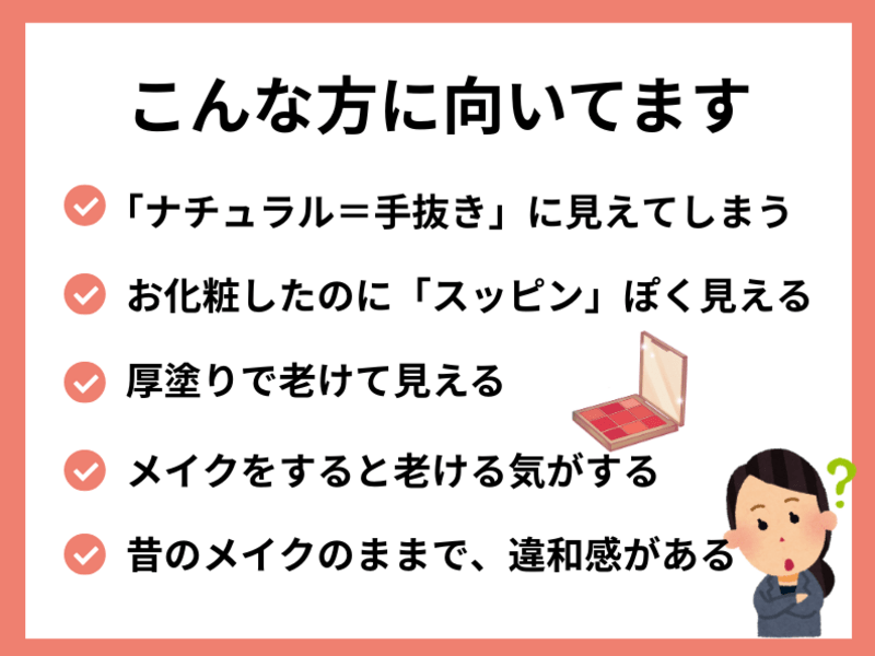 現在のメイクに迷っている方、ナチュラルメイクで過ごしたい方におすすめの講座です!