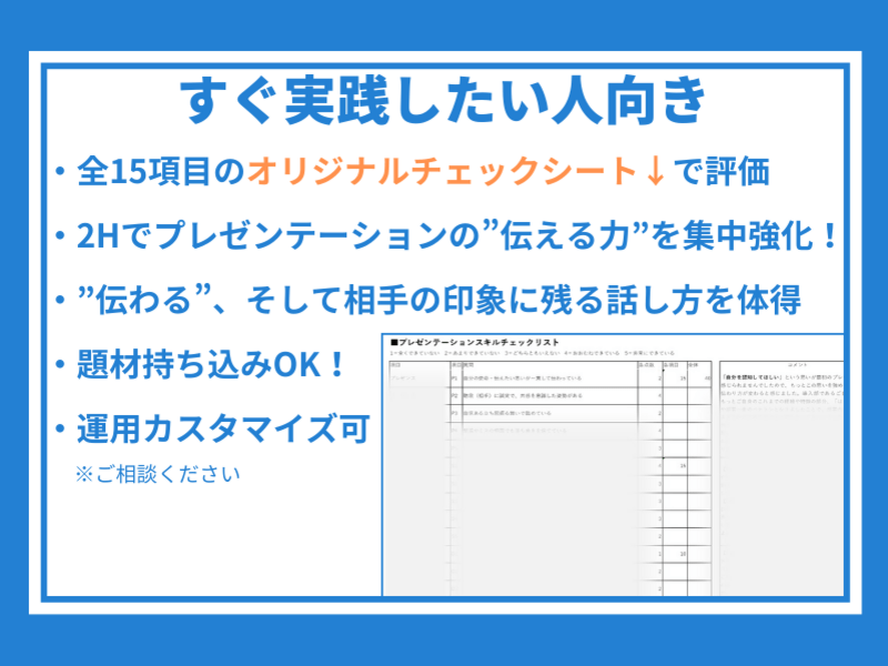 2時間きっちり個人のプレゼン課題の分析から、内容・構成の過不足チェック・悩みに寄り添う講座です。