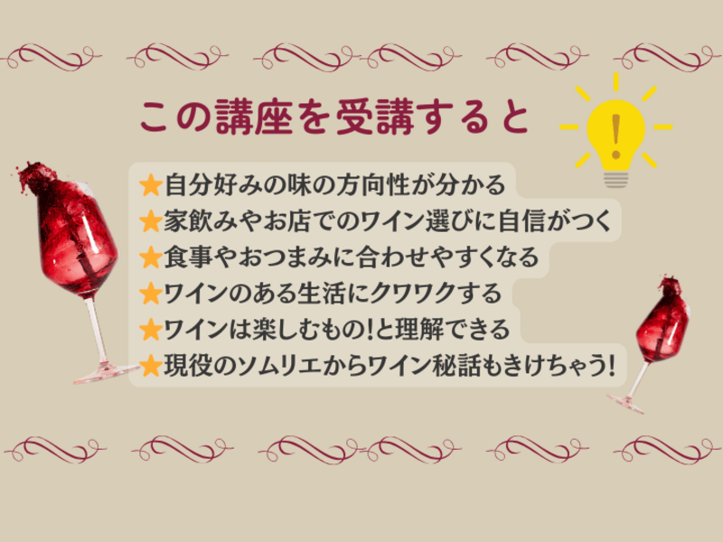 自分好みのブドウ品種が分かったこと、ワインと合うおつまみやどういうポイントでワインを選んだらいいかなどの細かい所まで教えて頂けて、大変参考になりました。講師の方が、とても話しやすかったので、質問なども気軽に出来ました。