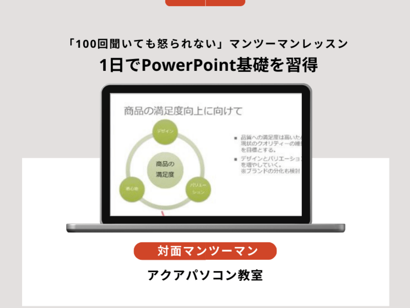 ExcelやWord、PowerPointをはじめ、WordPress、Illustrator&Photoshop、Java、PHPまで様々な講座を開講、すべてが初心者向けです。「100回聞いても怒られない」をモットーとする現役ベテラン女性講師がレッスンいたしますのでご安心ください。マンツーマンレッスンは講師と完全1対1なのでアナタのペースで学べます。グループレッスンは最大3名様までの少人数... +続きを読む