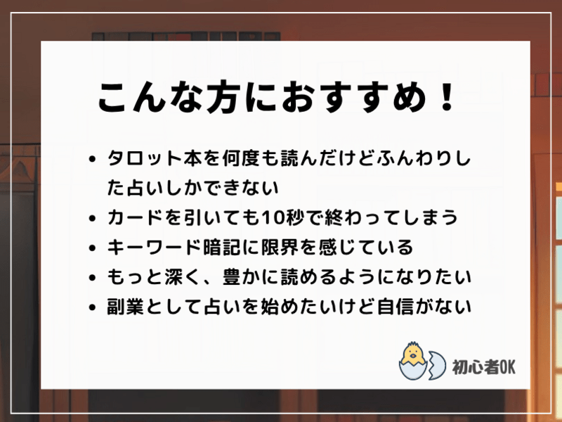 難しいところもあるのですが、講座を受講したあと、実際にリーディングで活用できる部分から取り入れてみると、自分の中でもどの物語が出てきやすくなり、腑に落ちる鑑定結果が出てきやすくなったと思います。