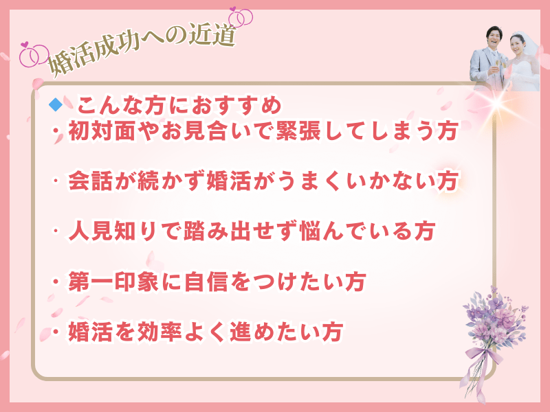 特に婚活では服装・髪型・会話の第一声・姿勢など細かい印象の差が出会いの結果に直結します