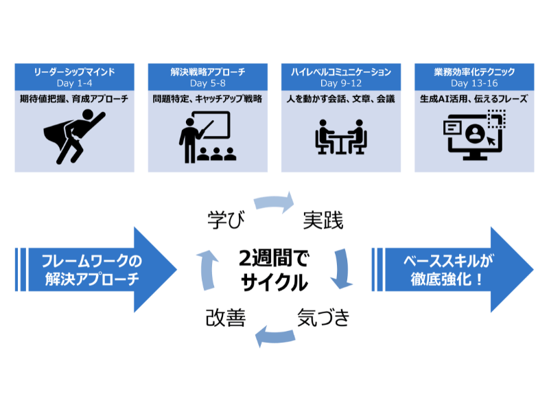 主旨を捉えた会話手法、わかりやすい文章表現、ゴールに導く会議ファシリテーションなどのコミュニケーション面から、複雑な課題を生成AIを検討パートナーとして解決する手法など、基礎から応用まであらゆるお悩みに対応できます。