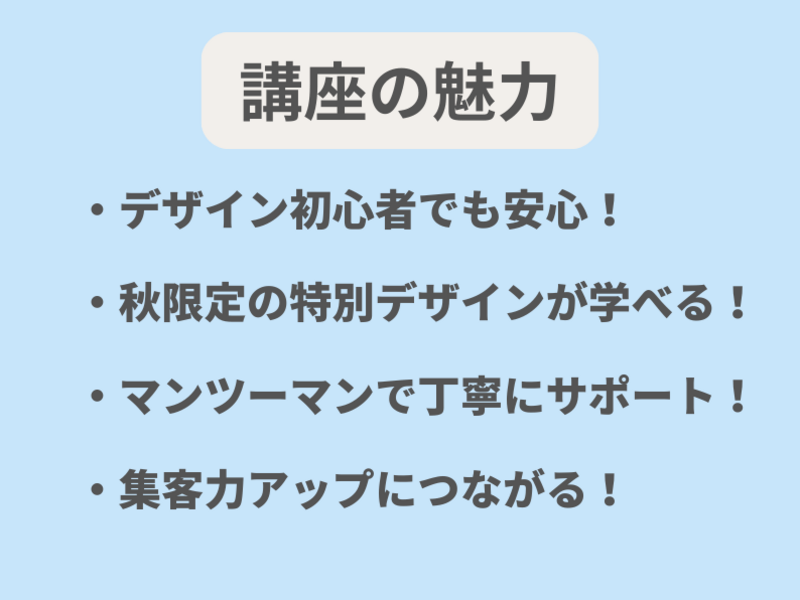 この講座では、あなたのお店にぴったりなチラシをその場で完成させることができます。