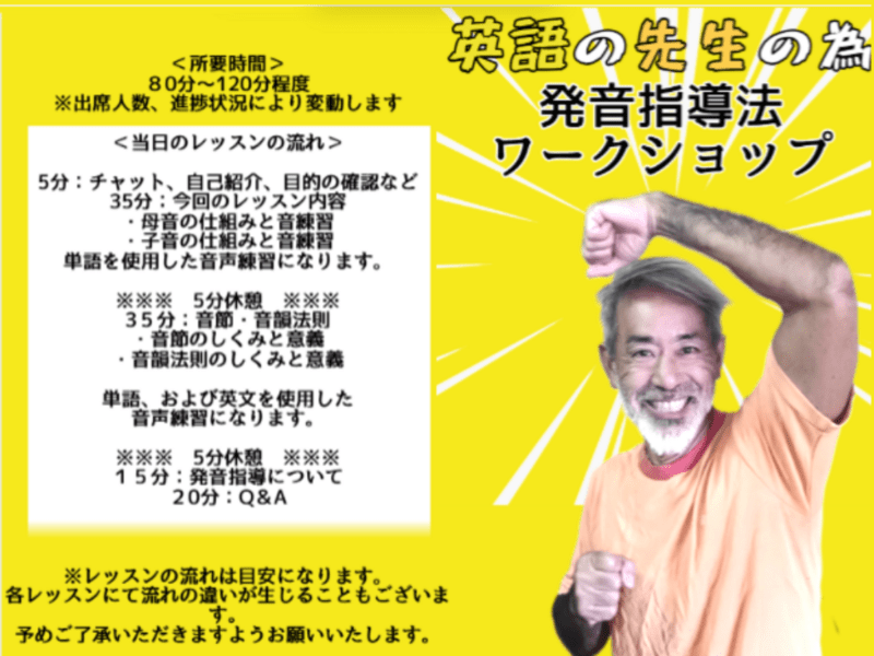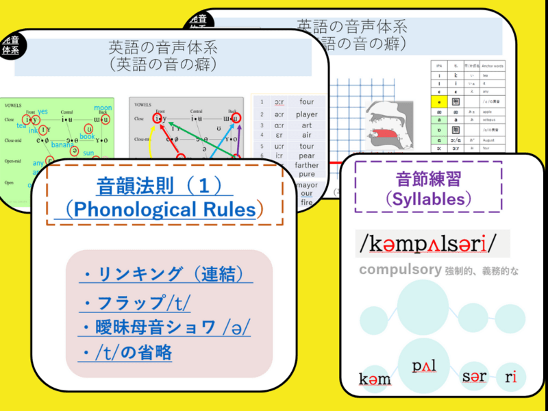 単語を使用した音声練習と音素に関する理論的お話になりますが、時間が許す限り、各々の発音の再発見(まさぐり活動)により発音の再認識へのきっかけを見つける