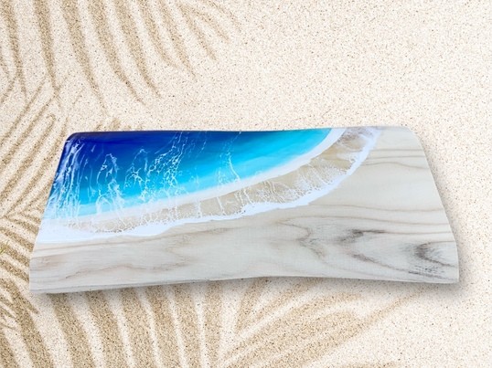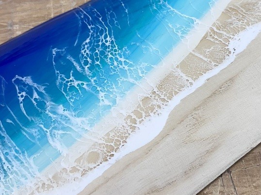 幅約300㎜の一枚板を使用します。塗料で海や波を表現し、レジンで仕上げます。世界に一つの海のアートパネルを作りませんか?