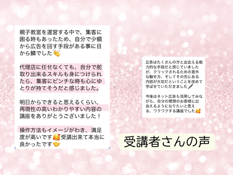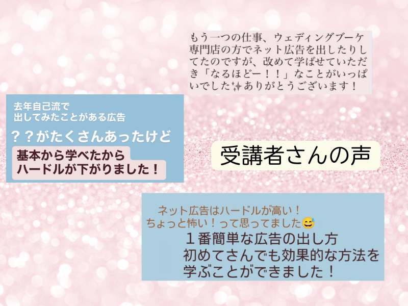 インスタ広告は全く回したことがありませんでしたが、基本から教えていただき、「これなら私にもできそう!」と思える講座でした!