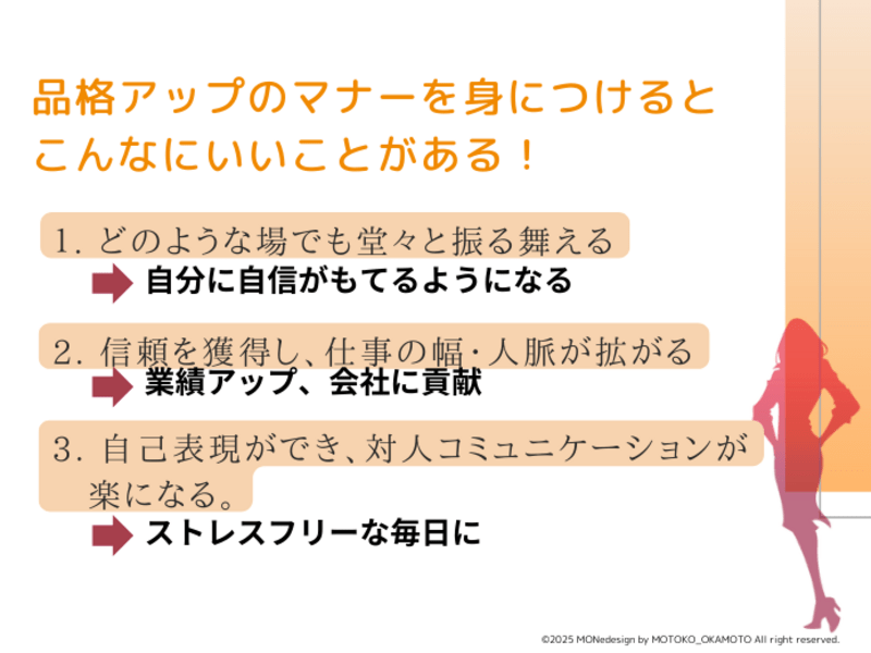 ビジネスマナーを学びながら、自分の魅力と品格を磨きたい方に、心からおすすめします。