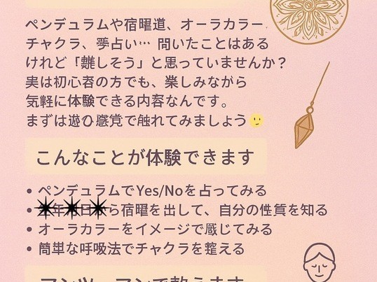 その対話をベースに、ペンデュラムを用いたリーディングや、宿曜道・オーラカラー・チャクラ・四大元素診断などを組み合わせ、さまざまな角度からお伝えしています。