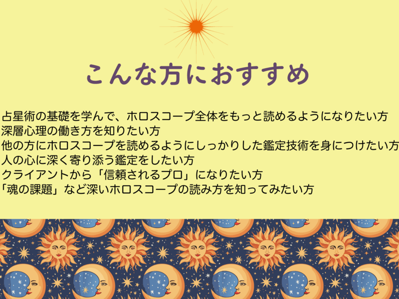 西洋占星術の基礎的な知識(惑星・サイン・ハウス・アスペクトを一通り学んだこと)がある方向けのステップアップ講座です。 基礎からしっかり学びたい方は、まずはこちらの講座の受講をお勧めします。