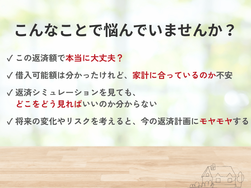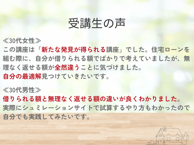 住宅ローンを組む際に、自分が借りられる額でばかりで考えていましたが、無理なく返せる額が全然違うことに気づけました。