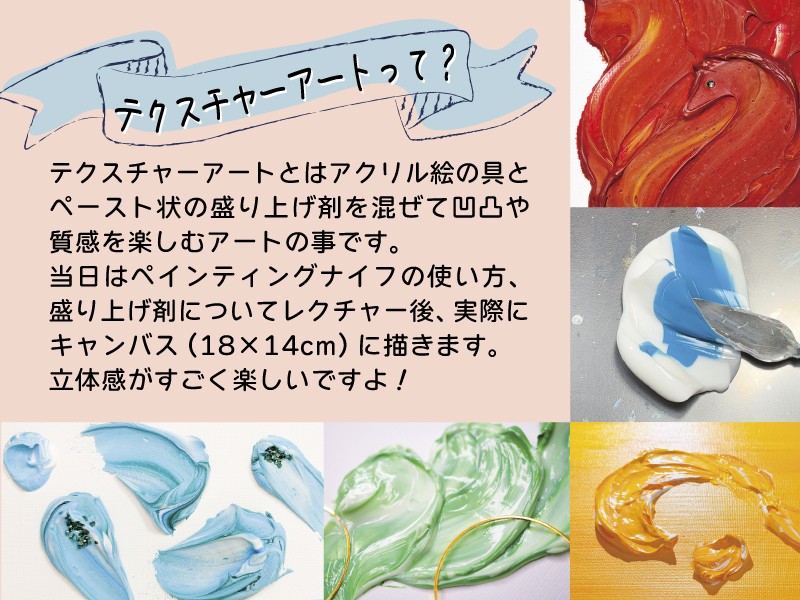 大人向けのワークショップです。落ち着いた雰囲気の中で立体感が特徴的なテクスチャーアートに挑戦してみませんか?