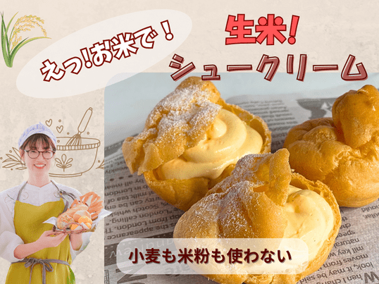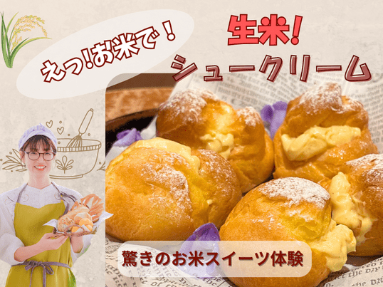 シュークリームは初めてで少し難しかったですが先生に分かりやすく、優しく教えて頂きました。先生が気さくで、喋りやすかったので質問もたくさんできました。笑顔で応えて頂き、有り難かったです。形は微妙でしたが、ちゃんと膨らみ、食べてみるとちゃんとシュークリームでした。生地もクリームも、とっても美味しかったです😋お米でシュークリームができるなんて感激です。