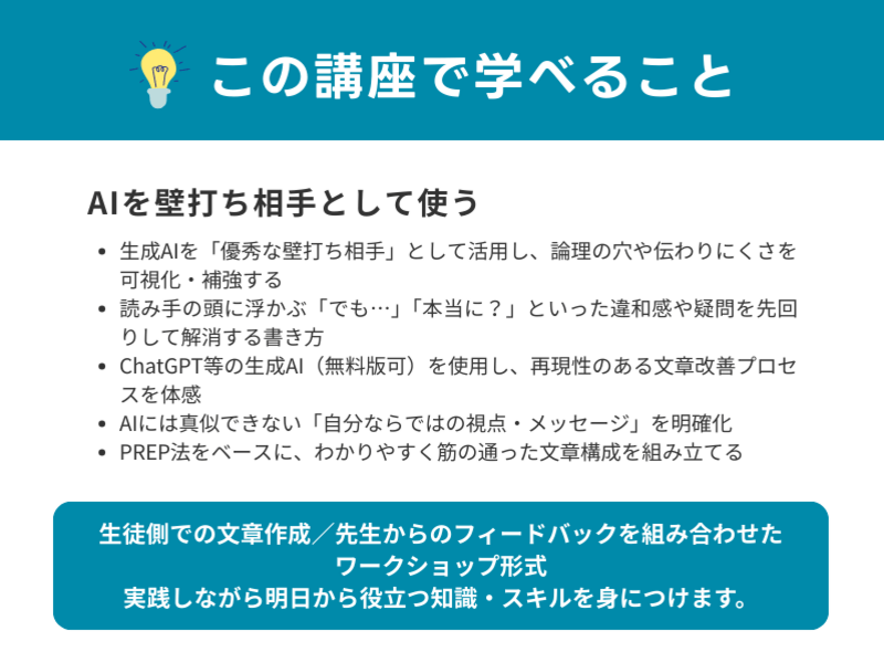 この講座では、個人ワークを通じて「自分の思いを自分の言葉で伝えること」の大切さを改めて学びました。AIツールの登場により、一から文章を作るより効率的にまとまった文章を生成できる利点もあります。しかし、AIが作成した文章はありきたりで「魂がこもっていない」と上長から指摘を受け、改善の必要性を感じて受講しました。特に印象に残ったのは「AIは一次情報を理解できない」という言葉です。自分が体験し、感じて伝えたいことや相手に寄り添う表現は、自分自身で考える必要があると再認識しました。講師の説明はわかりやすく、受講生の方々の言語化力にも刺激を受けました。学びの多い有意義な時間をありがとうございました。
