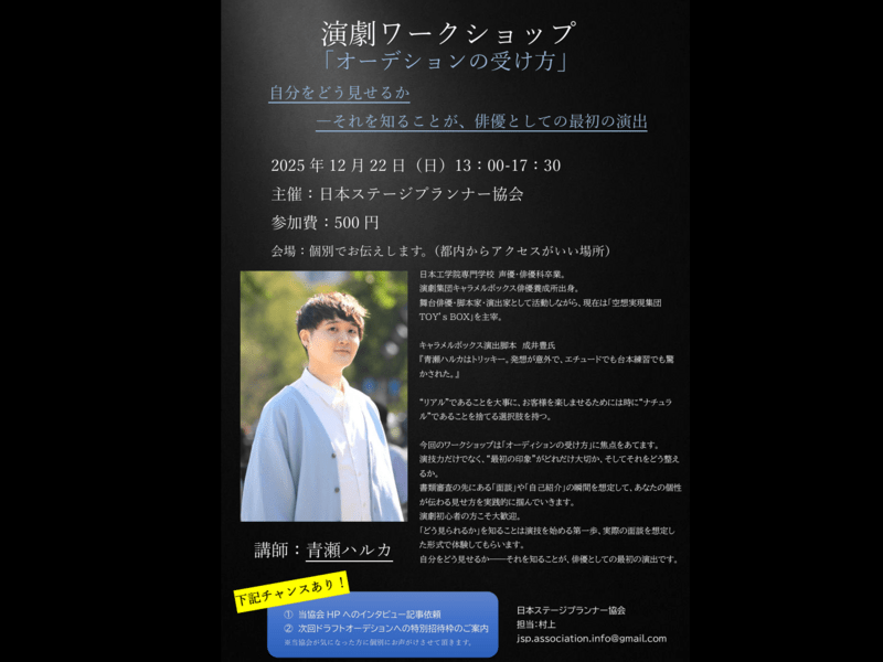 自分という存在を客観的に見つめ、 俳優としての第一歩を磨いていく実践的なワークショップです