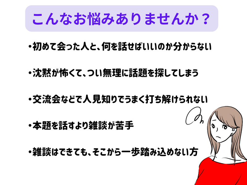 いわゆる「雑談テクニック」でもなく、○○だから人見知りなんだ・初対面だと話せないんだ、という一方向からの見方でもなく、まず捉え方から見直せるような内容です。緊張しないように・とにかく話さなくちゃ、という自分だけでぐるぐるしてしまう状態からどうしたら抜け出せるかも、具体策を教えてくださいました。