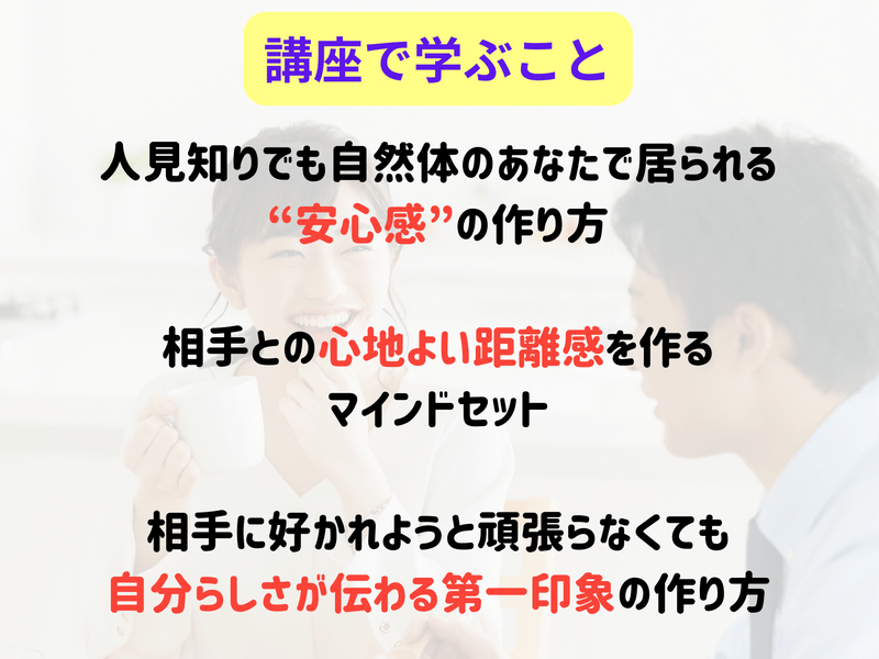 「ちゃんと話さなきゃ」と空回りして疲れやすい方や、人見知りで交流会が苦手な方に、ぜひ受けてほしい温かい講座です。